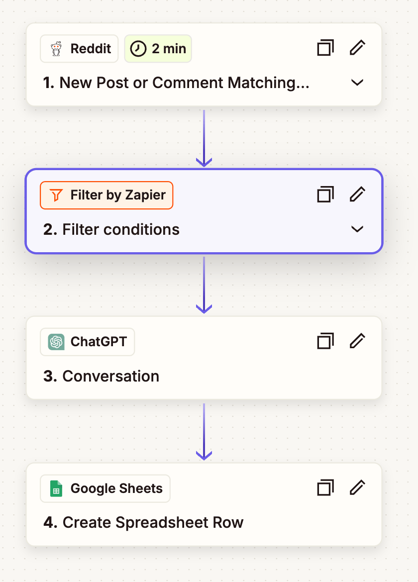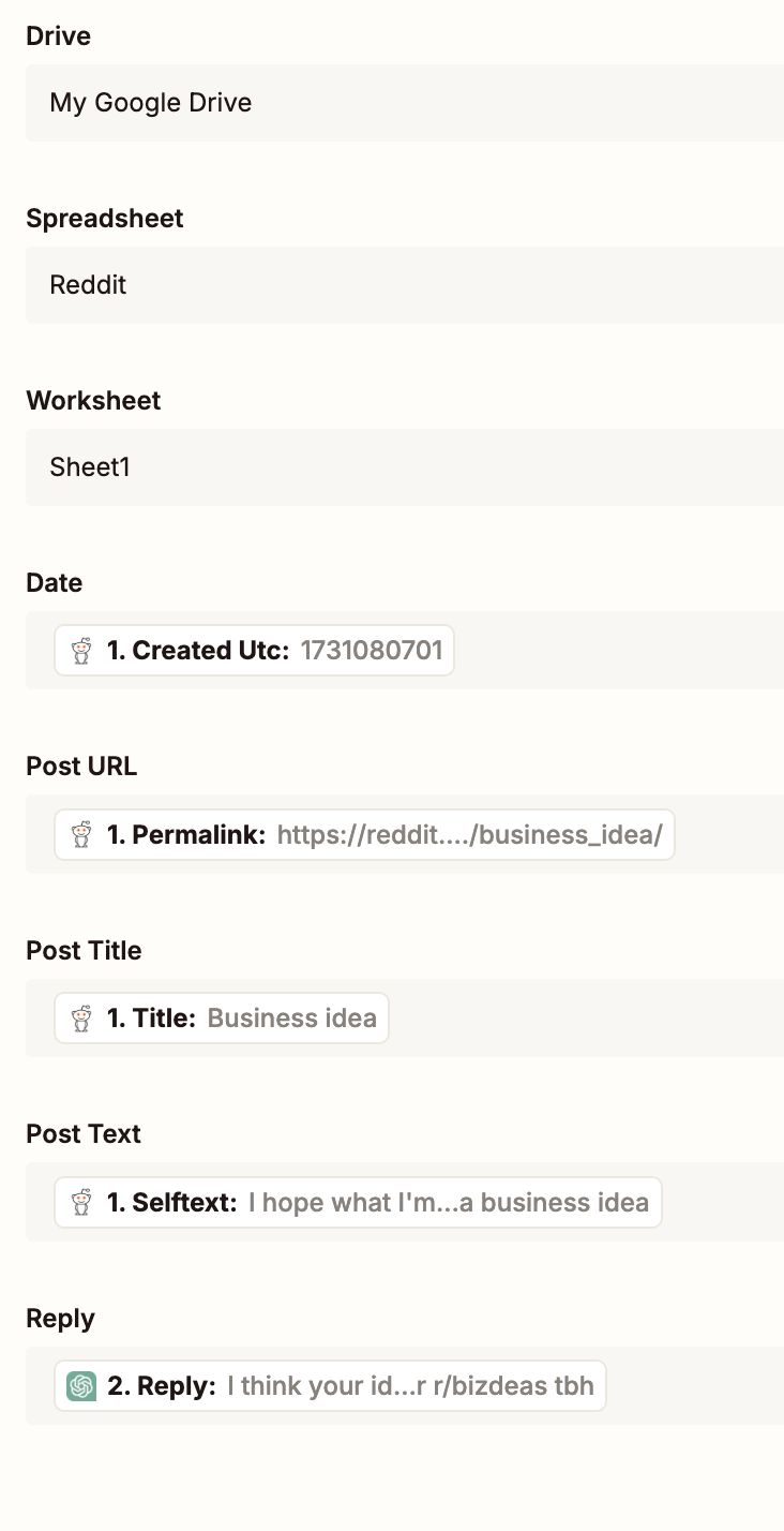 Every time someone posts to Reddit, OpenAI + Zapier will write your reply on that Google Sheet….BUT…you still have to post it! That must be done manually via clicking the link inside the Google Sheet and then pasting your comment. It takes 5 seconds AND you can automate this with an AI agent but that’s an email for another day.
