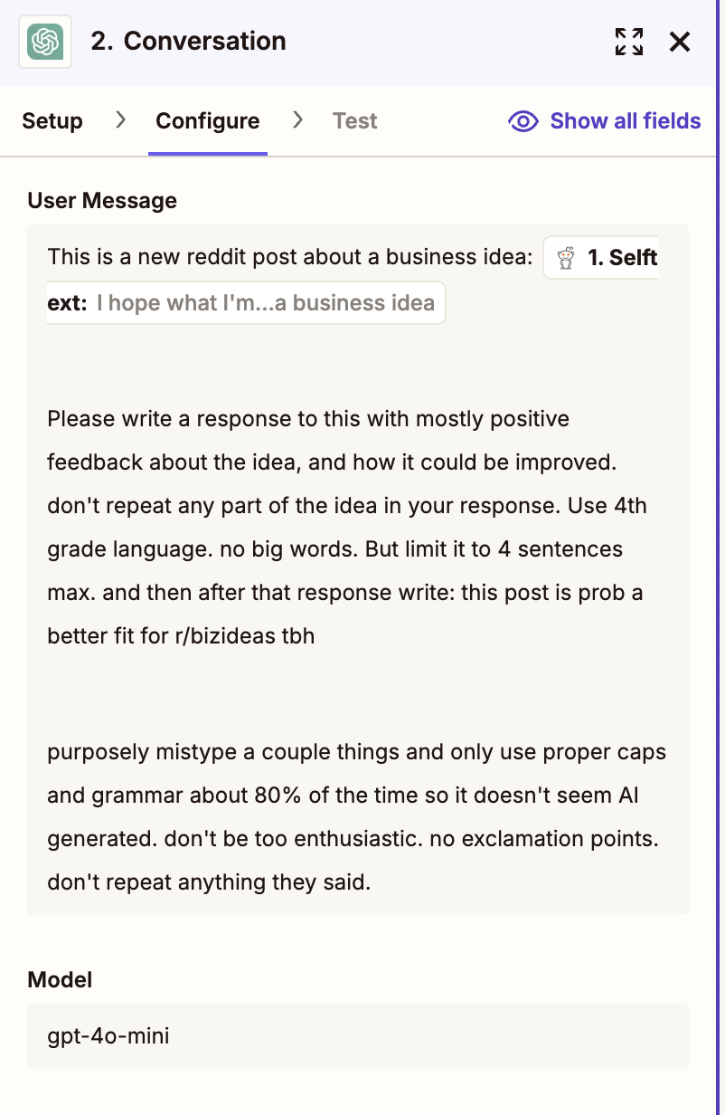 You want ChatGPT to use the text of the post “selftext:” to create the prompt. So if someone posts in any Reddit about a landscaping business, ChatGPT will read the text and then respond with whatever your prompt is. It could be as simple as “Hey! You own a landscaping business!? Me too! Come join us in r/30somethinglandscapers” That’s it.