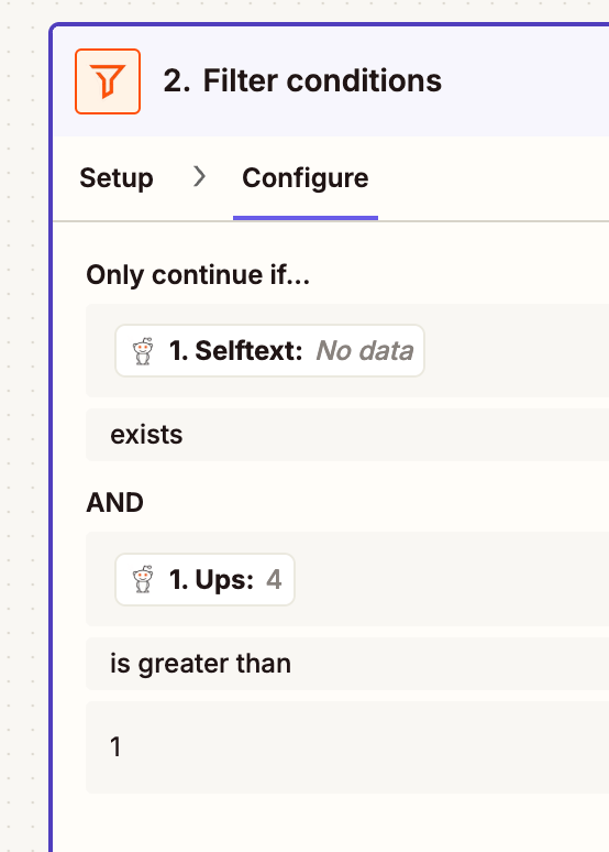 Before you choose the action step you need to create a filter to ensure that you don’t comment on posts with no text and only media. You also want to find posts that are quickly rising in popularity, by making the filter settings like the below. This will only show me stuff that HAS text and 2+ upvotes: