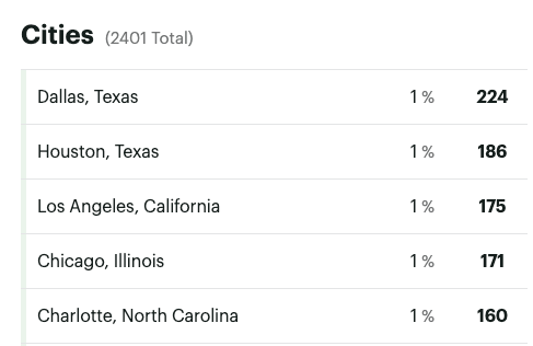 How can I tell? Well, that part is a little janky. Below are the top 5 cities for my last 5 episodes.